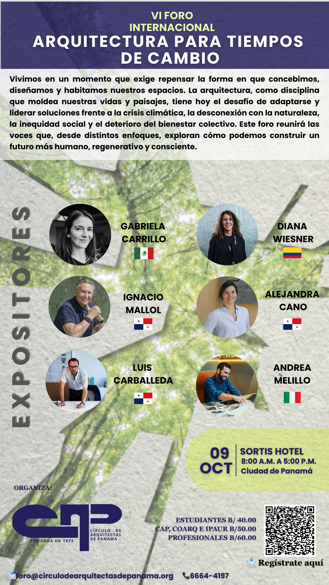 El Círculo de Arquitectas de Panamá (CAP) presenta su evento bienal insignia: el Foro Internacional, en su sexta edición con el tema Arquitectura para tiempos de cambio; evento de reflexión que invita a repensar la forma en que concebimos, diseñamos y habitamos nuestros espacios. En este marco, resulta imprescindible reconocer que vivimos en una época marcada por crisis ambientales, desigualdades urbanas y sociales, así como por la necesidad urgente de replantear nuestra relación con la naturaleza.